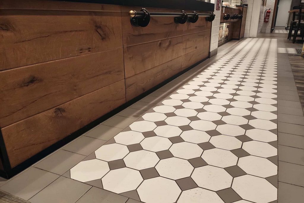 Für dieses Projekt wurden über einen italienischen Speziallieferanten eigens Fliesen angefertigt, die den Stil der historischen Originale nahezu identisch aufnehmen. Die Boden- und Wandfliesen verbinden nostalgische Optik mit modernen Materialien und wurden präzise auf das Gestaltungskonzept der Bäckerei abgestimmt.
